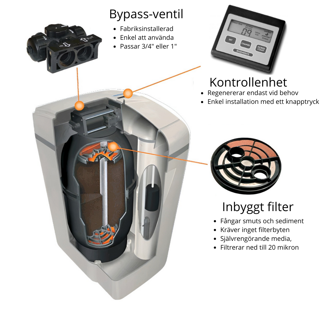 Filtren är kompakta men kraftfulla, kräver ingen backspolning och är enkla att installera och underhålla. Ett populärt val för fritidshus eller fastigheter med måttlig vattenförbrukning.