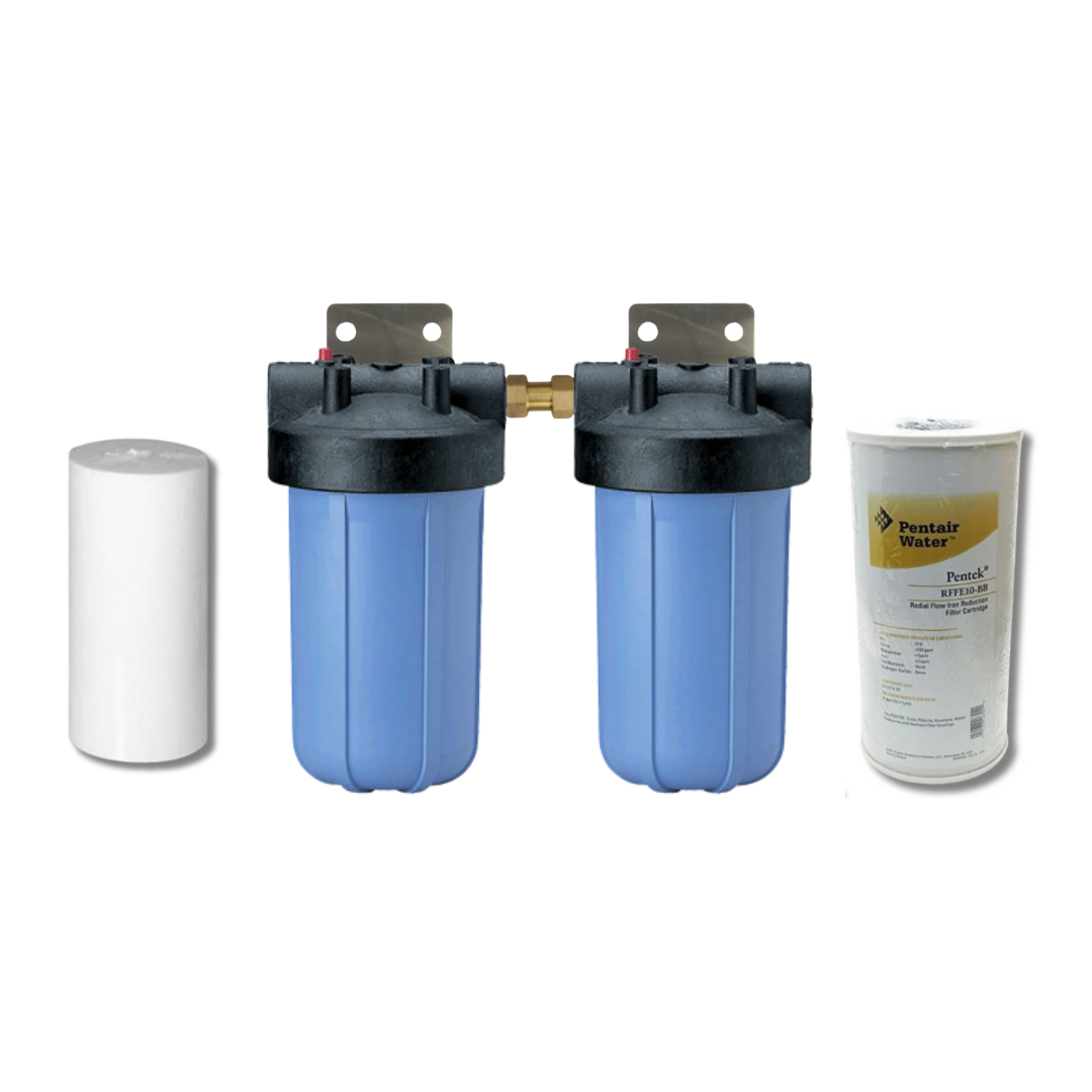 Komplett 2-stegs filtreringssystem i 10” standardhus för reduktion av sediment och järn. Steg 1 avlägsnar partiklar och grumlighet, medan steg 2 reducerar järn – helt utan el, avlopp eller kemikalier.
