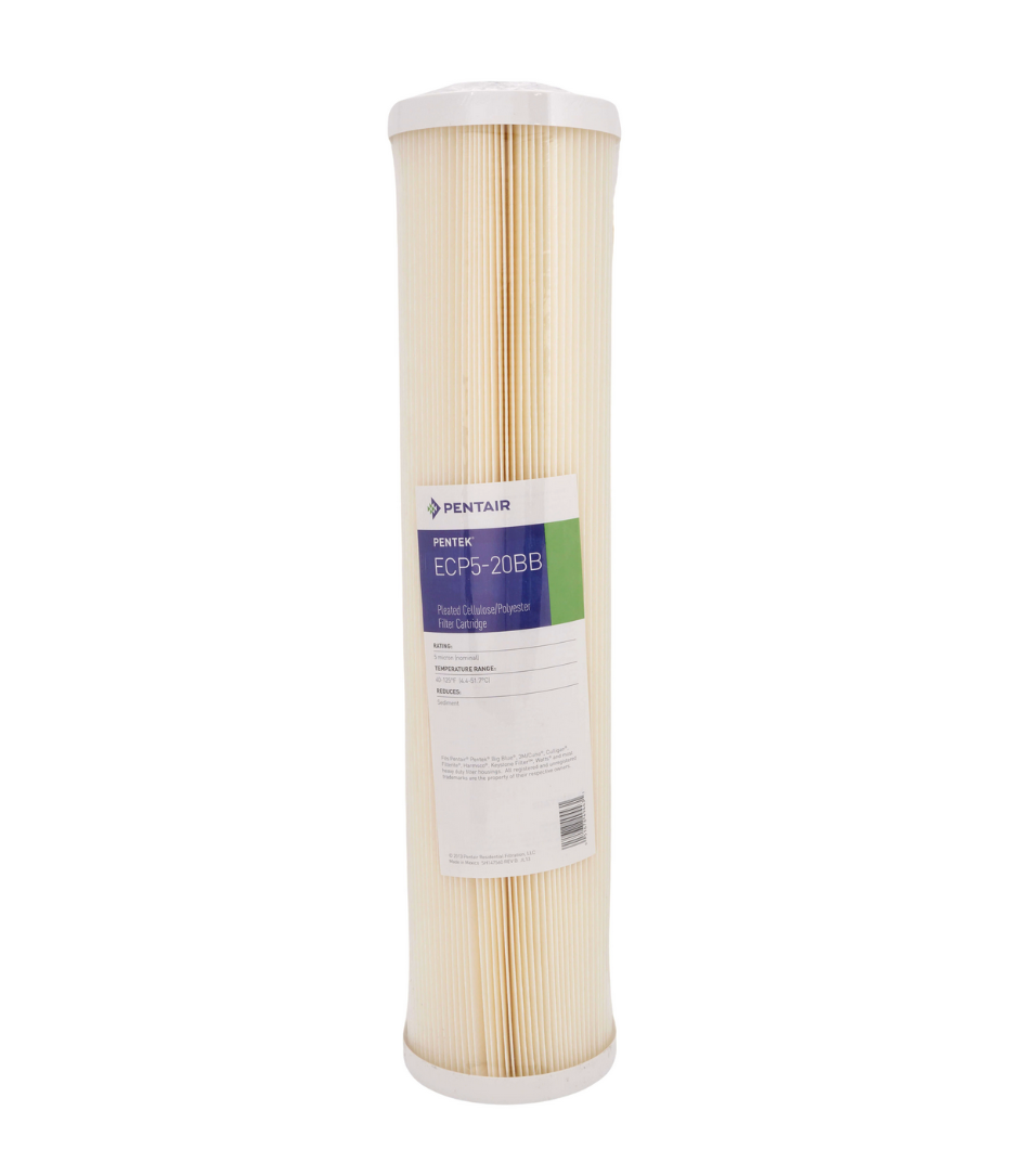 Pentair Pentek ECP5-20BB är ett veckat filterpatron av cellulosa och polyester som kombinerar hög smutshållningskapacitet med lågt tryckfall. Filterpatronen har en nominell filtreringsgrad på 5 mikron och måtten 11,4 x 50,8 cm. Den är anpassad för höga flöden upp till 76 liter per minut och ger effektiv partikelrening i vatten från olika källor.