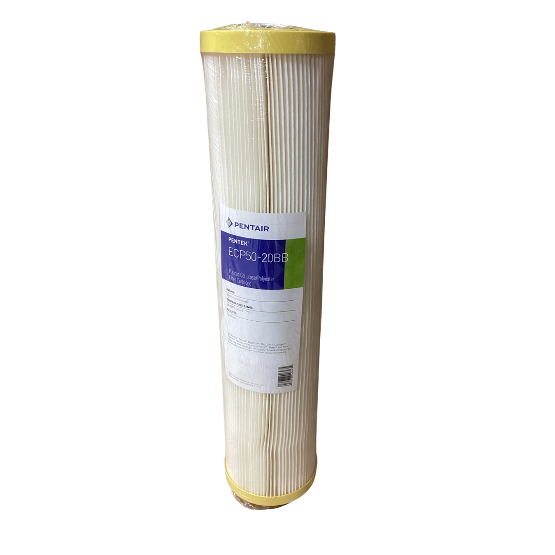 Pentair Pentek ECP50-20BB är ett veckat filterpatron av cellulosa och polyester med hög smutshållningskapacitet och lågt tryckfall. Patronen har en nominell filtreringsgrad på 50 mikron och mäter 11,4 x 50,8 cm. Den är anpassad för höga flöden upp till 76 liter per minut och ger effektiv filtrering av partiklar i vatten från olika källor.