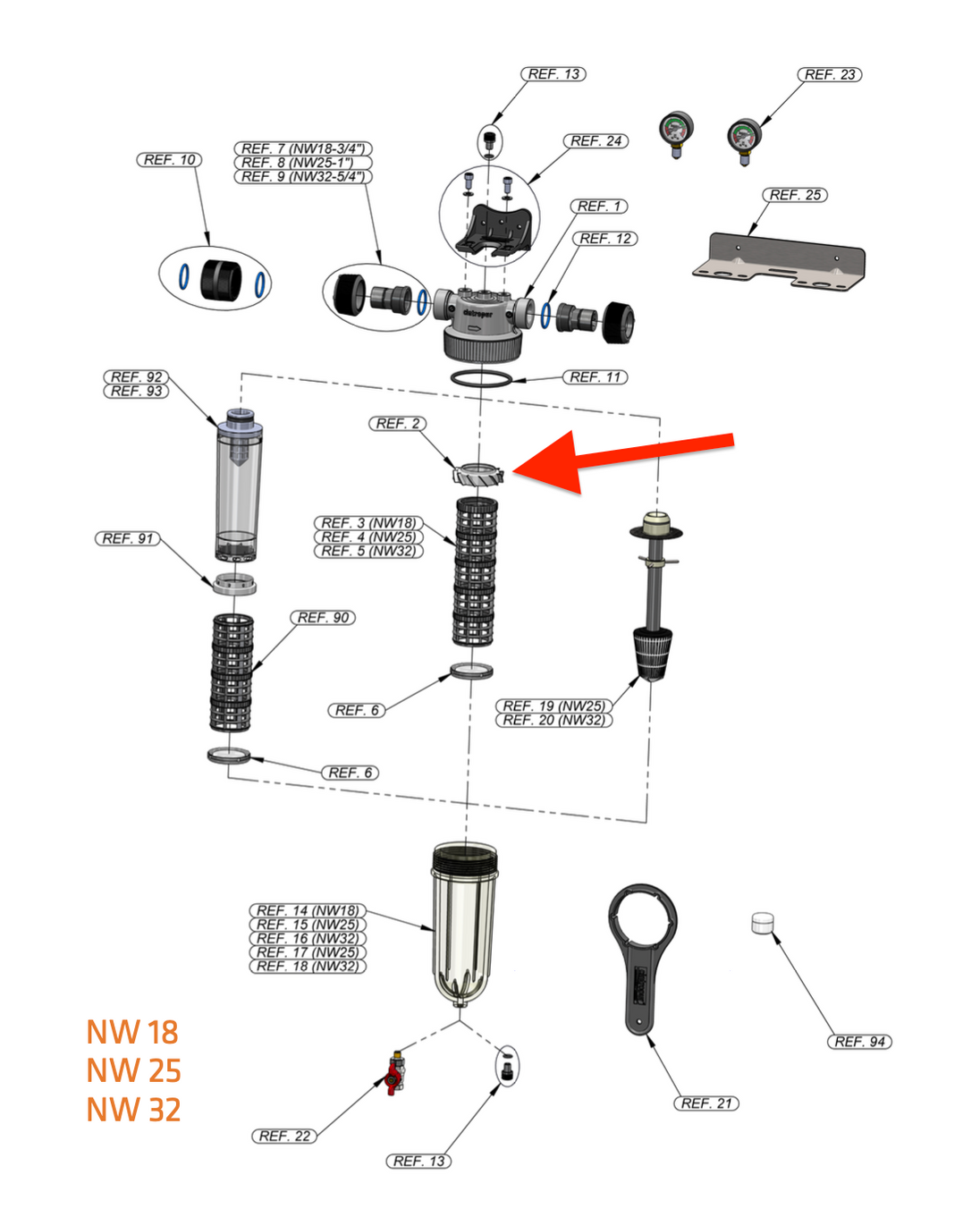 Håller filterstrumpan på plats i den övre delen. Monteras ovanpå filterhylsans stöd och skapar en cyklonisk effekt i det inkommande vattenflödet för effektivare filtrering.