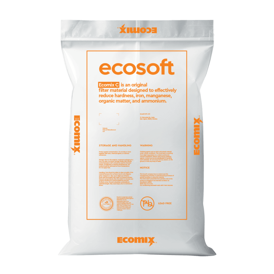 Multifunktionellt filtermedia som effektivt tar bort hårdhet, järn, mangan, ammonium och organiskt material ur brunns- eller kommunalt vatten. Tack vare sin unika flerlagersammansättning levererar ECOMIX® C mjukt och klart vatten även vid varierande vattenkvalitet.
