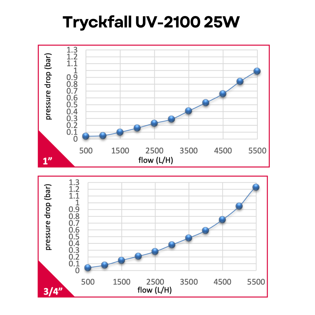 - Maxflöde vid 25mJ/cm²: 1700 liter/h
